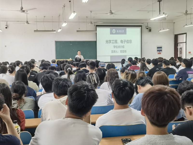 分享会上,邓亚栋学长以自身求学与职业发展历程为切入点,率先对其任职的浙江师范大学光学工程及电子信息等硕士学位点进行了详细介绍。他从学科优势、团队力量、科研平台、研究方向等方面展开,分享了学位点在光学成像技术、智能信息处理等领域的前沿成果,为大三学子拓宽了院校和专业选择的视野。随后,他进一步为同学们精准剖析考研形势,明确树立多个热门考研方向,涵盖新能源材料、超材料与超表面、量子物理等前沿领域。他倾囊相授考研备考思路,从专业课程的重点梳理,到英语、政治的高效复习策略,都一一进行细致讲解。同时,邓亚栋还结合自身经历,为学弟学妹们分享了考研心态调整的技巧,鼓励大家在备考过程中保持积极乐观,坚定目标。现场互动频繁,面对学子们提出的关于院校选择、复试准备等疑问,邓学长均耐心解答,为同学们排忧解难、献计献策。