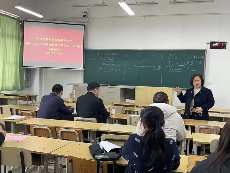 王辉、苑仲元、杜文园、刘万英4位教师按照第十三届江苏省高校基础物理教师上好一堂课竞赛要求进行展示,董玉玮老师和张荣老师分别从参赛内容的挑选、教学设计、课件制作、板书设计、教学语言等方面进行了详细点评,参赛教师受益匪浅。