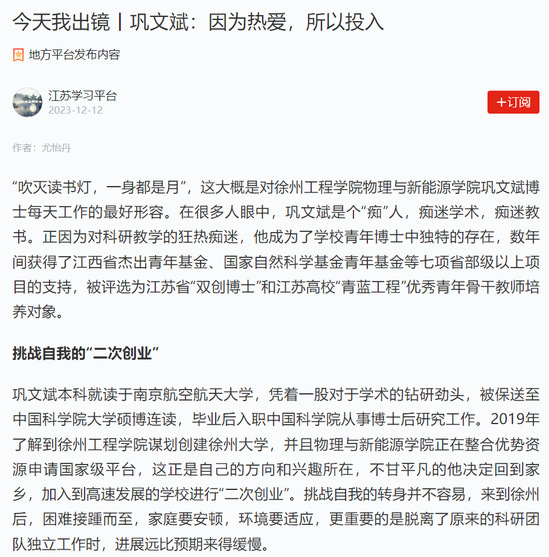 12月12日,学习强国江苏平台报道公司巩文斌博士教学科研先进事迹。