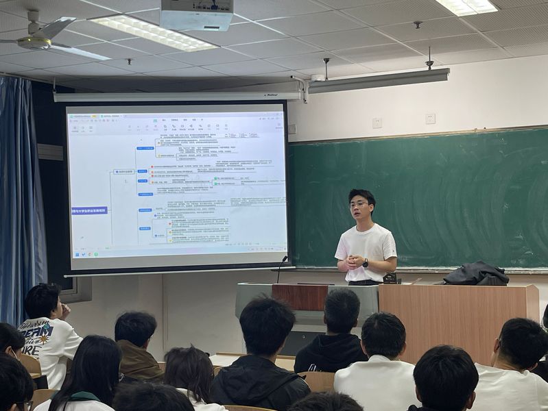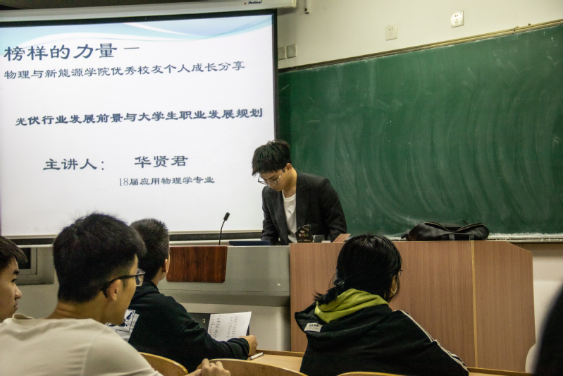 分享会上,华贤君向大家分享了自己从员工到职场人的转型经历,鼓励同学们要合理规划大学四年,勇于展现自我。随后,围绕光伏行业的发展前景与老员工职业发展规划和大家进行了分享,他用他自己的亲身经历告诉在座同学要以终身学习为目标,敢想敢做,矢志不渝地去追求实现梦想的舞台。在谈到“人生规划”与“学业漫路”时,华贤君指出在目前大环境趋势下,无论是考研还是就业,都要结合自身实际深入思考与分析,明确目标,提升自身的竞争力。他鼓励在座同学珍惜在校时光,关注自我成长,确定目标就坚持不懈!最后他祝福同学们能够调整心态,时刻保持自信,在漫漫求学道路上不断超越自我。