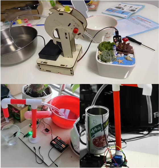 活动中,同学们发挥创意,将物理学与新能源相关知识巧妙融合,自制太阳能滴灌绿植模型。电子协会的同学们不仅积极参与模型的制作,还向同学们详细介绍了模型的设计原理和制作过程。通过太阳能电池板将光能转化为电能,实现了自动滴灌功能,既体现了环保理念,又展现了实际应用价值。