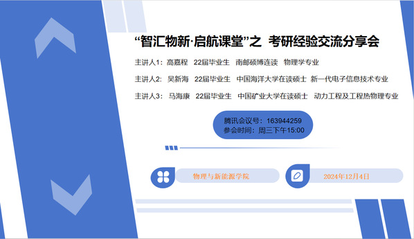 12月4日下午,Bevictor伟德官网在线上成功举办“智汇物新 启航课堂”之考研经验交流分享会,旨在帮助青年员工合理规划考研路径、优化备考策略。本次活动特别邀请了三位2022届考研优秀学子为物新学子传授宝贵的考研经验和备考心得。