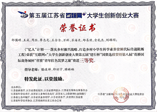 公司在第五届江苏省“互联网+”老员工创新创业大赛中获佳绩,滕道祥教授指导作品《“亿人”计划》获得省赛铜奖。